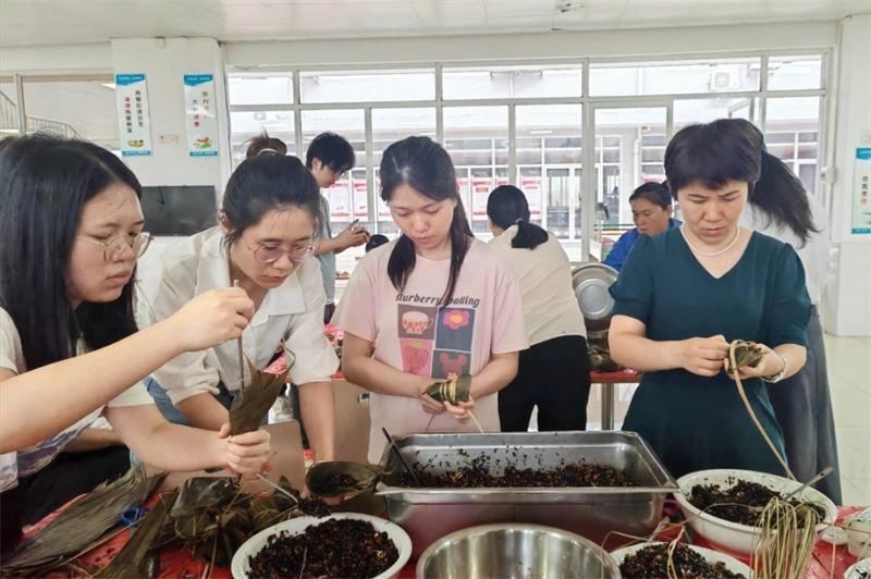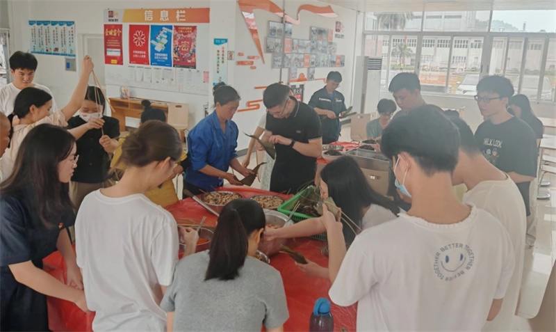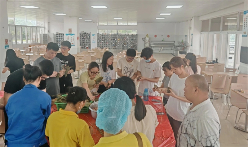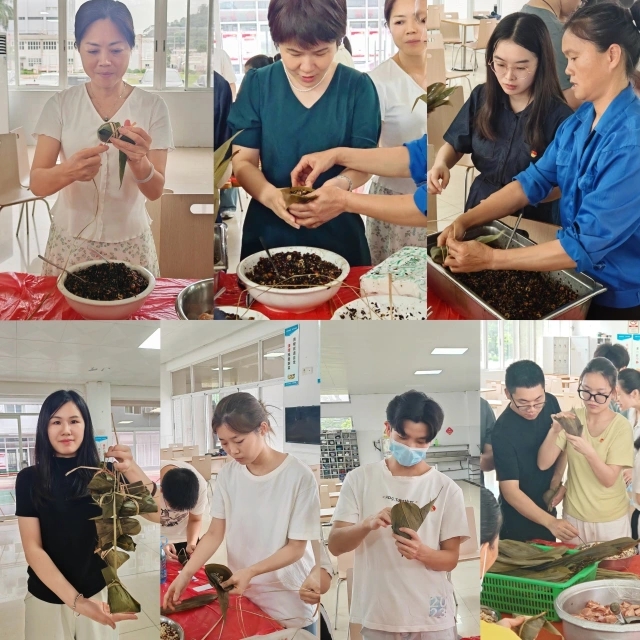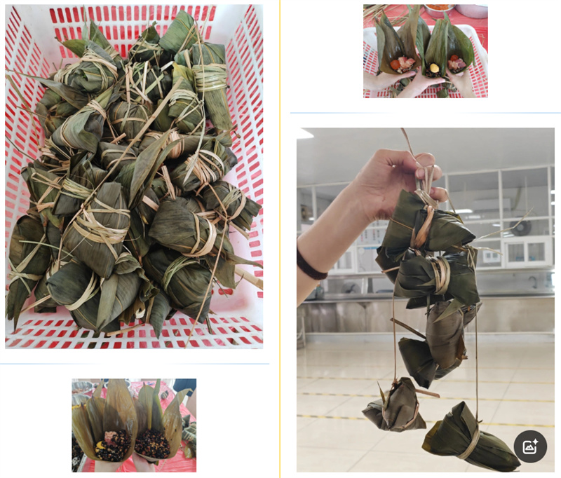 活動特邀后勤師傅現(xiàn)場教學(xué),從選葉、填料到捆扎,詳細(xì)講解了包粽子的傳統(tǒng)技藝。